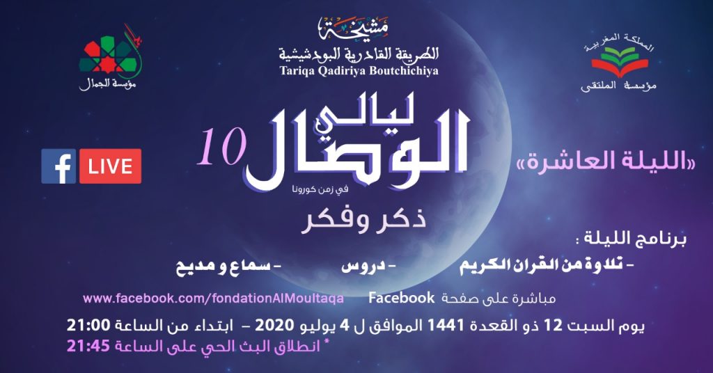 أعلنت مؤسسة الملتقى والطريقة القادرية البودشيشية بالمغرب عن تنظيم الليلة العاشرة من سلسلة “ليالي الوصال ذكر وفكر في زمن كورونا” بالتعاون مع مؤسسة “الجمال”، وذلك السبت ٤يوليو، بمشاركة عدد من العلماء الأكاديميين والمنشدين، إضافة إلى شهادات حية لمريدي الطريقة من جنسيات تنتمي إلى دول مختلفة. وأكد الدكتور مولاي منير القادري بودشيش، رئيس مؤسسة الملتقى العالمي